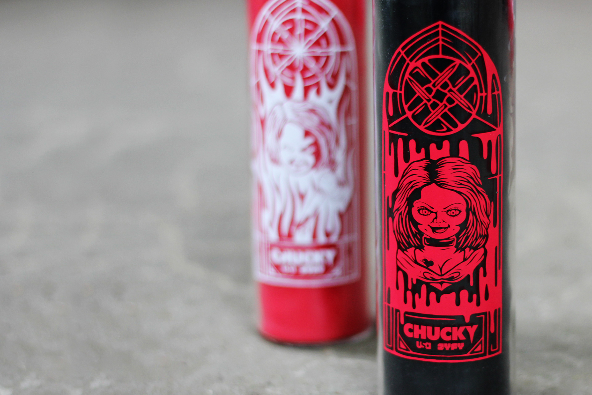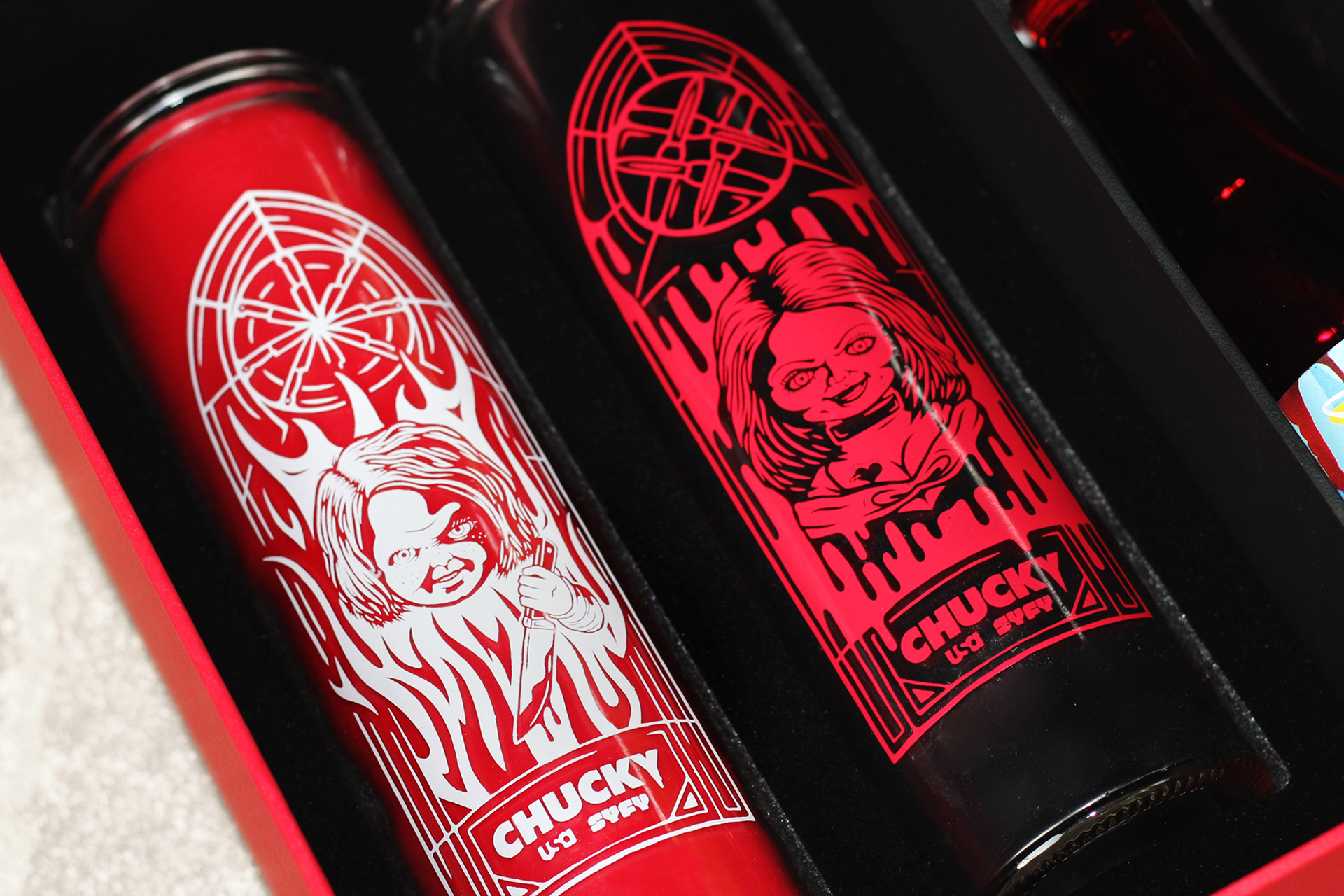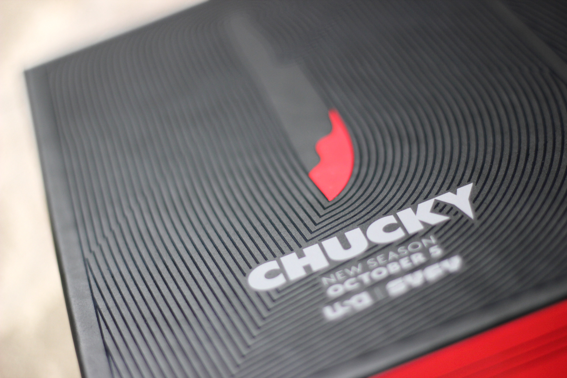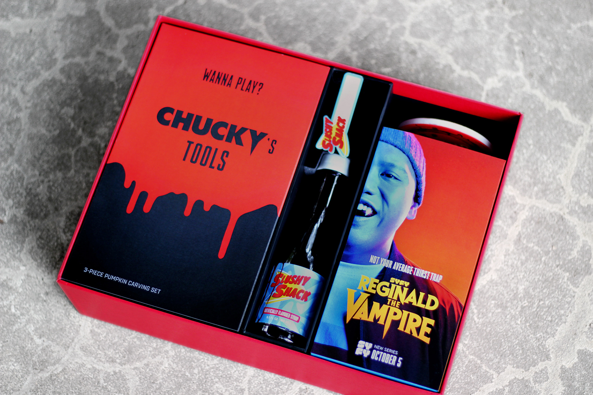 The press kit featured a spot gloss finish cover and included branded items such as Chucky prayer candles, a pumpkin stencil and carving tools, and a slushy maker cup with blood red flavoring. Recipients were encouraged by Chucky himself to carve a pumpkin using the provided stencil and carving tools.